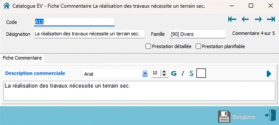 Un commentaire est un texte ajouté au devis sans quantité ni prix, destiné à apporter une précision descriptive au client.