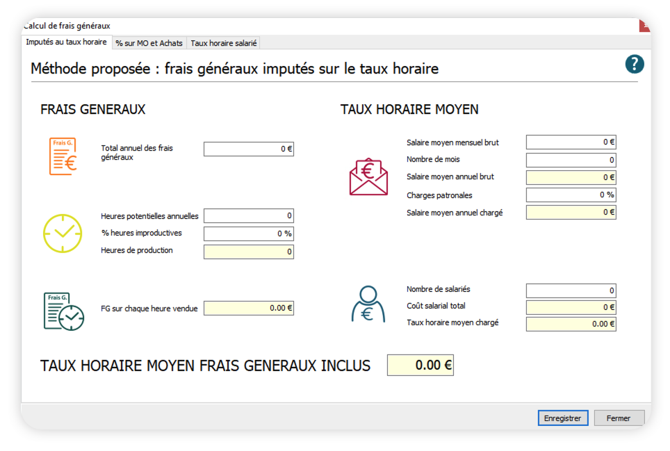 Plusieurs méthodes vous sont proposées :Imputés au taux horaire, % sur MO et Achats, Taux horaire salarié